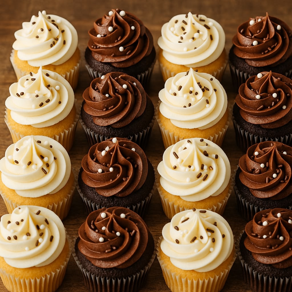 Ассорти из ванильных и шоколадных капкейков с универсальным декором. Начинки: карамель, клубника, ванильный пудинг