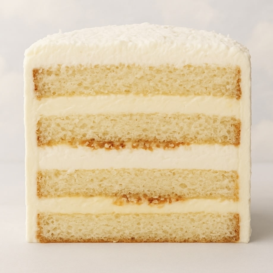 Воздушный белый бисквит с миндальным хрустящим слоем и кокосовым кремю. Сверху лёгкий пломбирно - кокосовый крем. Каждый кусочек — сладкая сказка, тающая во рту